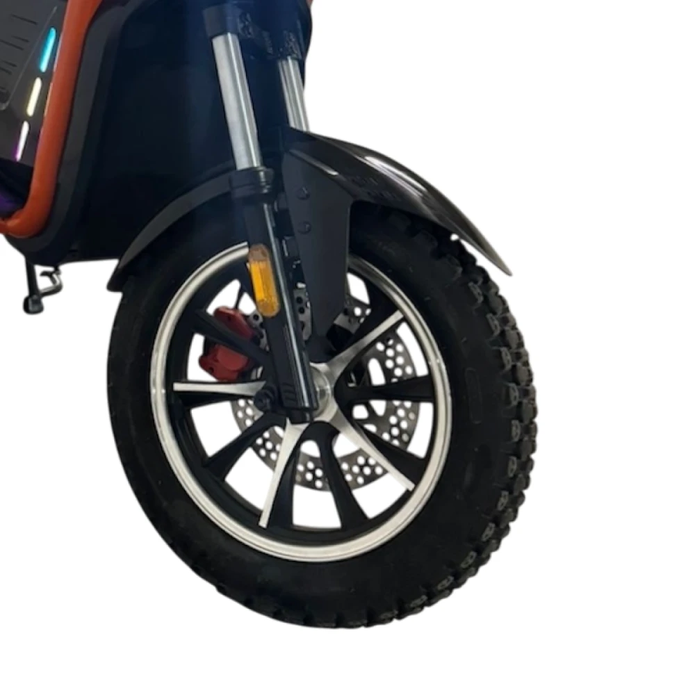 Мотор 1500 Вт даёт разгон до 65 км/ч, тянет подъёмы 25° при 200 кг; задний привод усиливает сцепление на неровностях. Li-ion АКБ 60V 45 Ач заряжается 7 ч, реальный пробег 60–80 км (эко 80 км, спорт 50 км); 3 режима + reverse регулируют скорость/мощность, повышая эффективность на 20–30%. Дисковые тормоза гидравлика; энергоэффективность высока благодаря контроллеру, быстрая зарядка — стандартная (полная за 7 ч).
