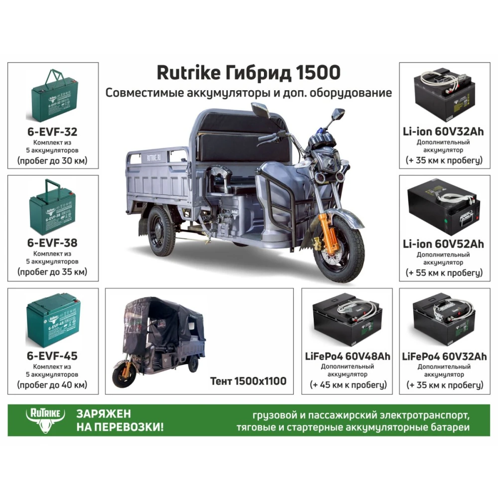 Грузовой электротрицикл Rutrike Гибрид 1500 60V1000W серый, заметный на фоне других тс. Понравился пользователям из РФ и СНГ. Предназначен для частных и коммерческих целей. Упрощает работу сотрудников, увеличивает КПД, позволяет сэкономить на горючем. Купить экологически безопасный комфортный трицикл по приемлемой стоимости предлагает наш интернет-магазин.
