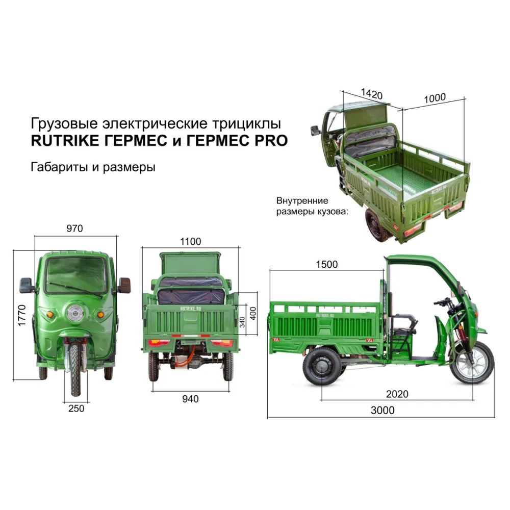 Грузовой электротрицикл Rutrike Гермес 1500 60V1200W темно-зеленого цвета - это надежный транспортный средство для перевозки грузов. Его мощность, грузоподъемность, всесезонная эксплуатация, барабанные тормоза и усиленные гидравлические амортизаторы в передней подвеске делают его отличным выбором для различных бизнес-потребностей.