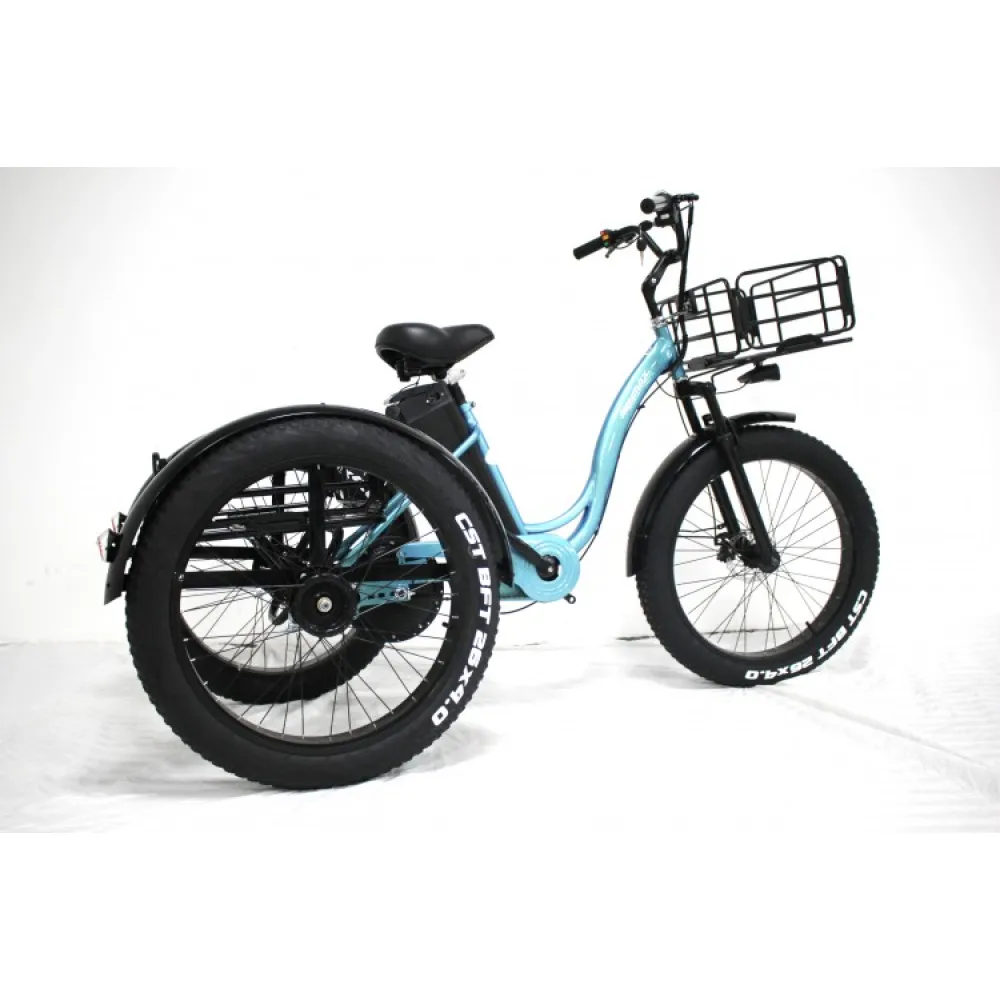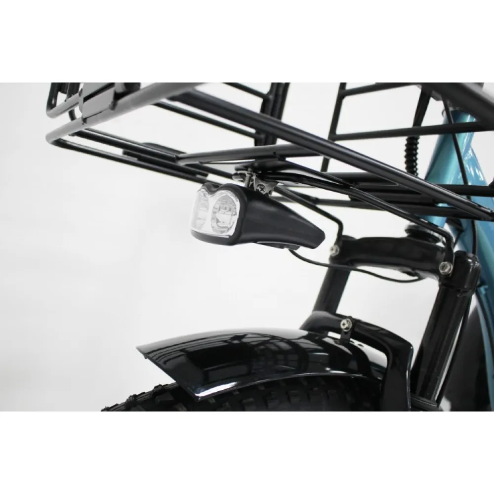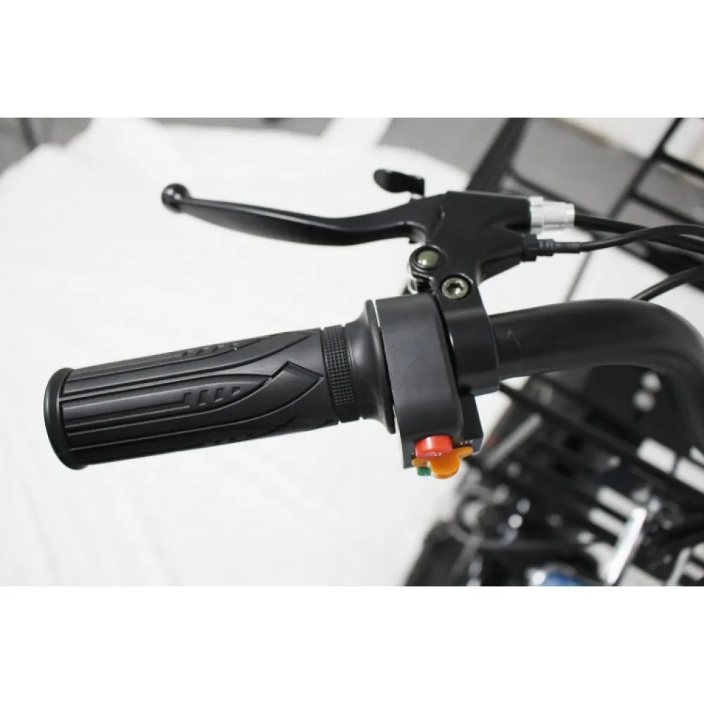 Технические характеристики электровелосипеда позволяют использовать его в пределах городской и сельской местности. Удобные корзины: передняя и задняя предназначены для транспортировки продуктов питания, рюкзака и других полезных для отдыха вещей.