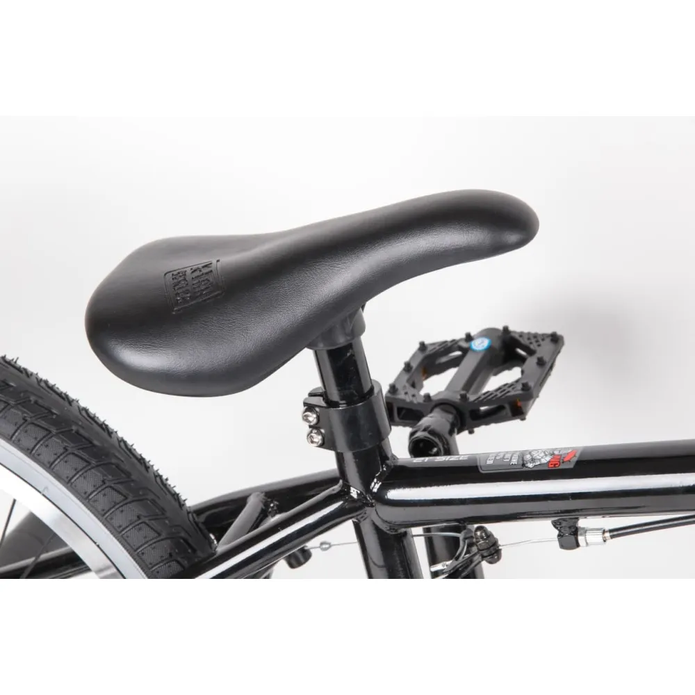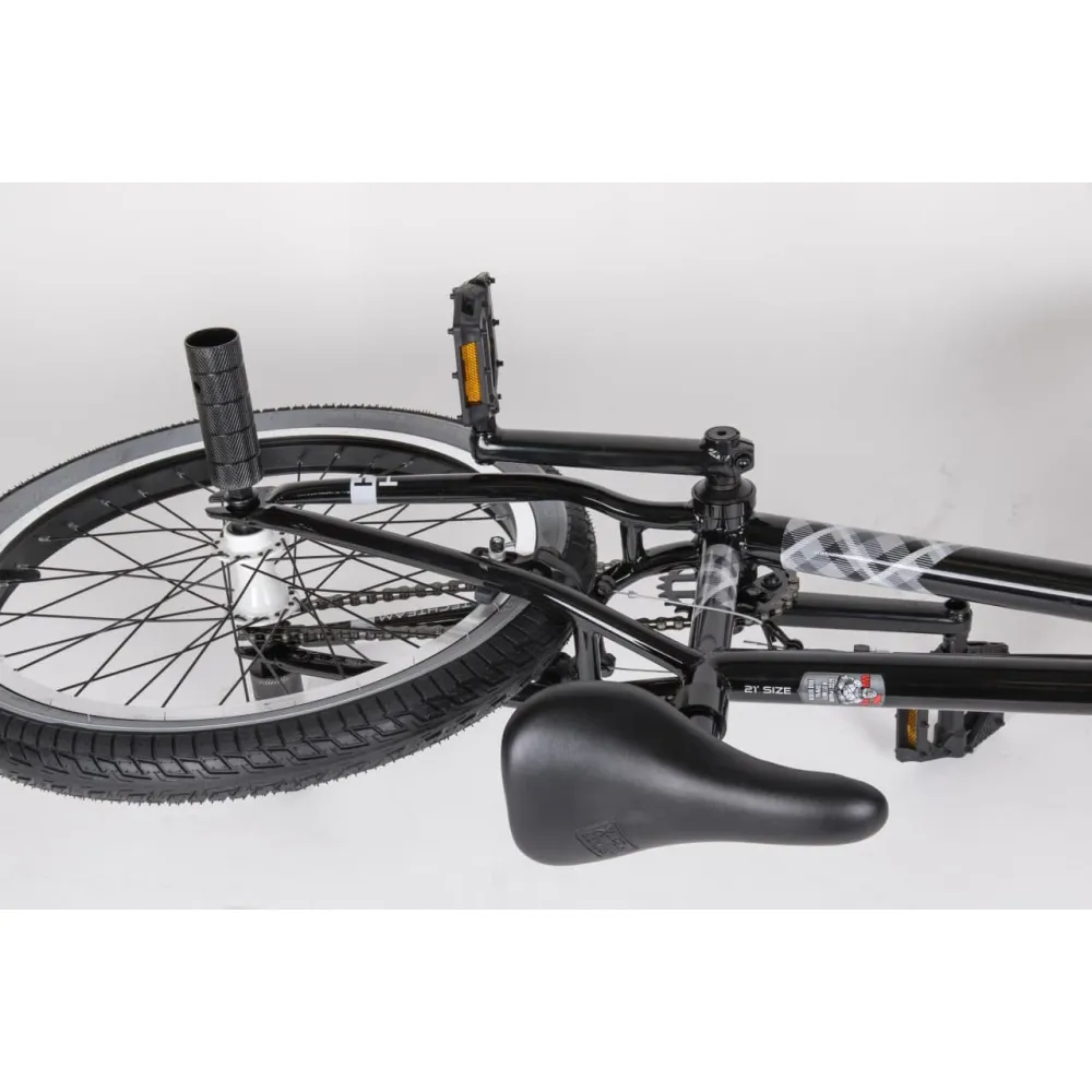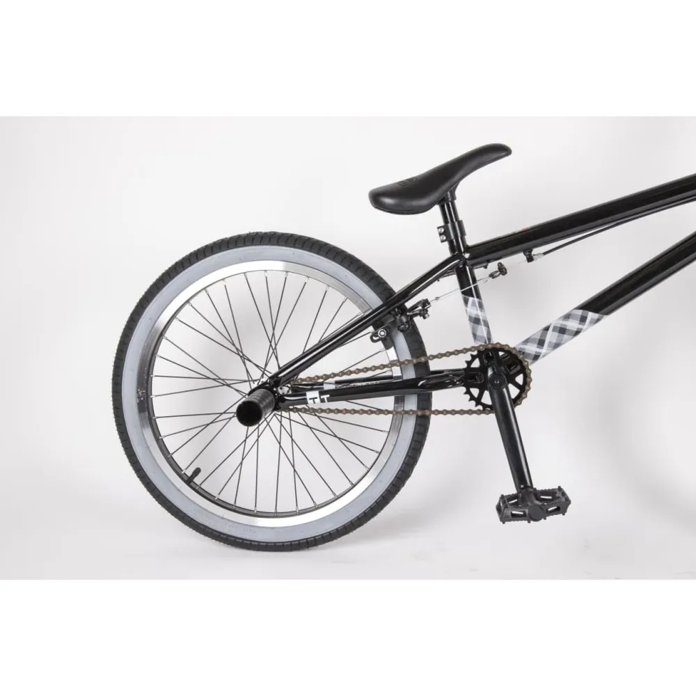 Надежная колесная часть на двойных алюминиевых ободах с накатистой резиной, брендовые покрышки, TT стальной 700 мм руль в сочетании с 4 пегами позволяют ставить трюки по рейлам и делать более серьезные манипуляции.